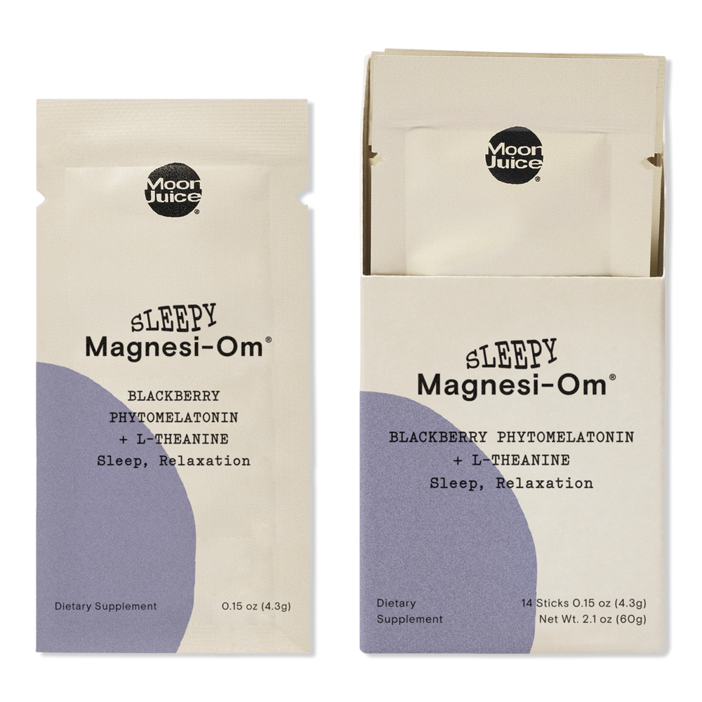 SLEEPY MAGNESI-OM STICKS. Benefits: Sleep supports slumber without the hangover, decreases duration to fall asleep, supports sleep quality*. Relaxation supports the bodys stress response and muscle relaxation*. Key Ingredients: Moon Juice's microdose of Phytomelatonin, extracted from plants, decreases duration to fall asleep.* Chelated, non-laxative Magnesium Bisglycinate and Gluconate support the bodys stress response and relaxation.* L-Theanine supports sleep quality.*. :