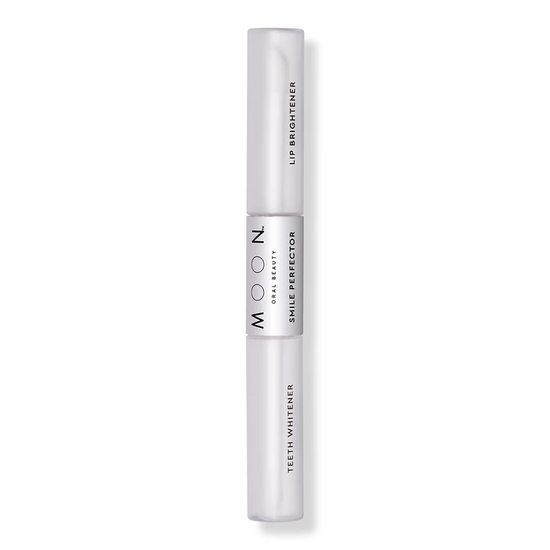 SMILE PERFECTOR DUO 0.17FLOZ. Benefits: Lip Brightener: a hydrating lip treatment with a subtle blue undertone that helps to cancel out yellow in teeth for a visibly brighter smile. With Vitamin E to nourish & smooth fine lines around the lips & Peppermint Oil to sooth dry lips. Teeth Whitener: Moon's best-selling Platinum Advanced Teeth Whitening Pen formula with 2x the whitening power yet gentle for all smiles. With light-reflecting pigments for an instantly brighter smile and an easy brush-on applicator for precision whitening.. Key Ingredients: Lip Brightener:. Ethically-sourced Blue Mica: Neutralizes appearance of yellow tones. Vitamin E: Nourishes & Hydrates. Peppermint Oil: Anti-inflammatory & Cooling. Elixir III: Lavender Oil (Soothing), Strawberry Extract (Whitening), Honeysuckle Leaf Extract (Cleansing). Whitening Active: Urea Peroxide. Flavor: Platinum Mint (Winter Mint Taste). Formulated Without: Parabens. Sulfates. Animal Products. Phthalates. Triclosan. Artificial Flavors.