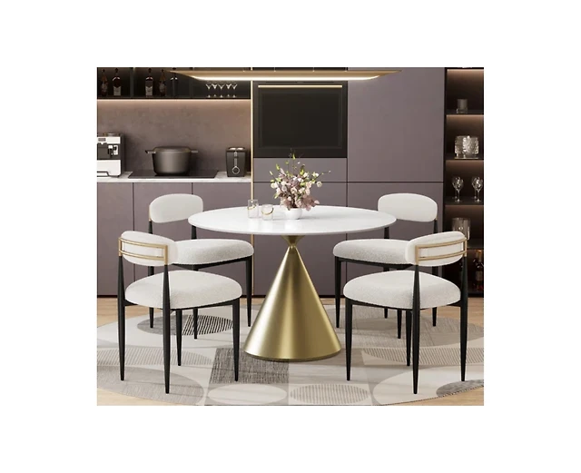 Morden Fort Modern Faux Marble Dining Set With 47" Round Table And 4 Boucle Armchairs Metal Base for Dining Room Kitchen