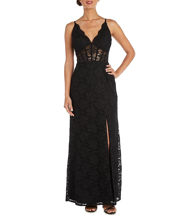 Morgan & Co. Sleeveless Spaghetti Strap Scalloped V-Neck Illusion Corset-Bodice Slit Hem Long Glitter Lace Dress