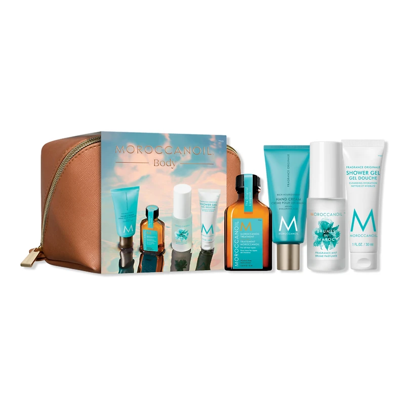 TRAVEL KIT - BODY. Benefits: Hand Cream is fast-absorbing yet intensely hydrating. Hair & Body Fragrance Mist features the Moroccanoil signature scent. Shower Gel is gentle, sulfate-free, and infused with argan oil to hydrate while cleansing. Moroccanoil Treatment helps boost shine, smooth frizz, and condition hair. Includes: Hand Cream Fragrance Originale (1.35 oz). Hair & Body Fragrance Mist (1.0 oz). Shower Gel (1.0 oz). Moroccanoil Treatment (0.85 oz). :