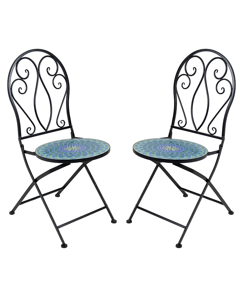 Sit back and enjoy the outdoors and add a pop of color to any space with this stylish mosaic outdoor bistro set. With a vibrant mosaic tile seat in cool shades of blue and green, this unique set of chairs will add style to the front porch, patio, garden, or backyard. They feature a sturdy iron frame with a classic black finish. Each mosaic folding chair features a sophisticated scrolling design on the back of the chair. Plus, these chairs easily fold up for convenient storage when not in use. Simply tuck them into a closet, under a bed, or in a garden shed during the off-season for protection. This lovely mosaic chair set can be paired with a bistro table for outdoor dining or placed on a porch as a creative way to display a planter, or in the garden to enjoy the great outdoors.
