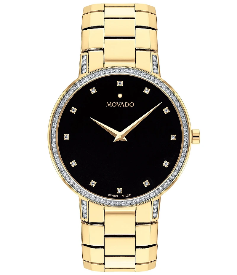 From Movado, the Faceto Diamond Accent Gold-Tone PVD Bracelet Watch features: Yellow gold PVD-finished stainless steel case and bracelet Black dial with 12 diamond markers & diamond-set bezel Diamond set lugs Quartz analog movement 108 diamonds Case size approx. 39mm 0.421TCW; Clarity SI Imported.