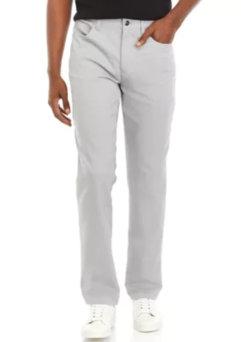 Feature-packed with innovative fabric technologies, these refined pants are part of the Calvin Klein Move 365 collection, designed for life-on-the-go. Crafted from an extra soft cotton stretch blend for all-day comfort, this sleek style is made with wrinkle-resistant fabric, a stretch waistband for an optimal feel, 5-pocket styling, logo detailing and a slim fit for a tailored look. Zip fly and button closure Belt loops Elastic waistband Classic 5-pocket styling Wrinkle resistant Slim fit Skinny leg Imported Material & Care Woven Cotton, polyester, elastane Machine washable