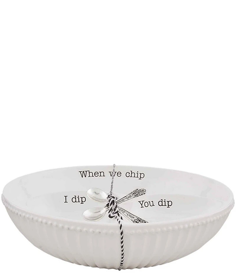 From the Circa Collection by Mud Pie, this chip and dip set features: Set includes chip and dip with 2 spoons Ceramic Stamped silverplated spoons Fluted beaded detail Two integral dip wells Perfect for everyday use Sentiment wording "When we chip", "I dip", " You dip" and on each spoon " Friend-chip" and "Companion-chip" Dishwasher safe Each Measures: Dish: 3" x 12"dia. Spoon: 3.5" Imported.