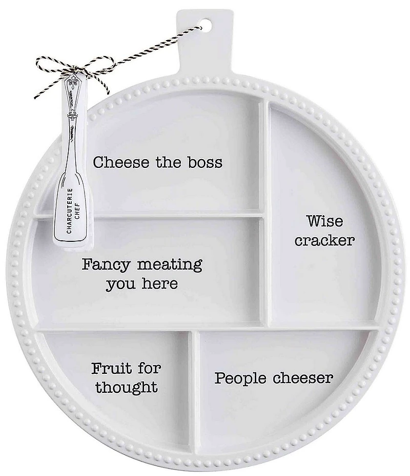From the Circa Collection by Mud Pie, this charcuterie board features: Melamine Melamine tong Five-sectioned beaded dividers Great for both indoor and outdoor use Sentiment wording in each divider: "Cheese the boss", "Wise cracker", "Fancy meating you have", Fruit for thought" and " People cheeser" Hand wash Each Measures: Board: 15" x 13" dia Tongs: 5.75" Imported