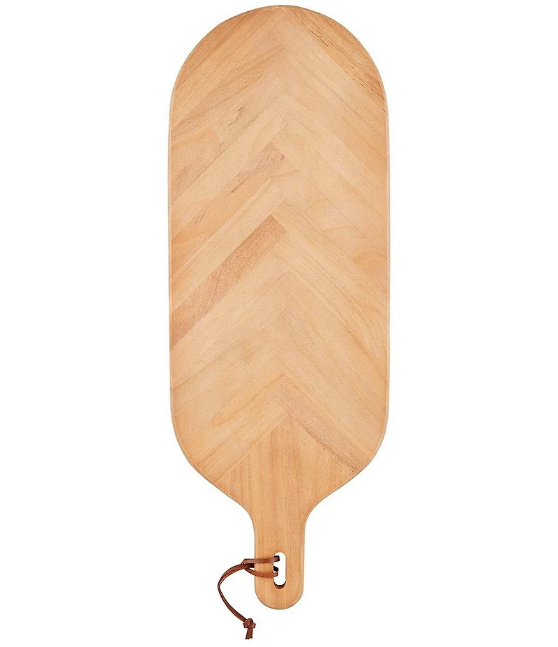From Mud Pie, this large board features: This exquisite herringbone beech wood paddle board is designed to elevate your culinary presentation. Wood Board Herringbone beech wood paddle board Faux leather accent loop Hand wash Approx. 25.75" x 9.5" Imported.
