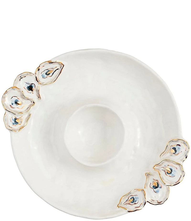 From the On The Half Shell Collection by Mud Pie, this chip n dip features: Stoneware Figural oysters shell on rim Hand-painted detail Hand wash Measures: 2" x 10.5"dia. Imported.