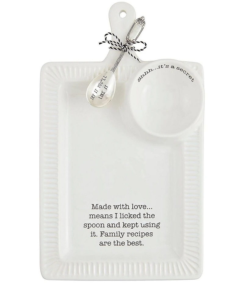 From the Thanksgiving Collection by Mud Pie, this chip n dip features: Set includes dish and spoon Ceramic Stamped silverplate spoon Perfect for any occasion Sentiment wording on dish: Dish -"Made with love means I licked the spoon and kept using it. Family recipes are the Best" Dip Bowl - "Shuuu... it's a Secret" Spoon - "Try it you'll like it" Dishwasher and microwave safe Each Measures: Dish: 15.25" x 9" Spoon: 5.5" Imported.