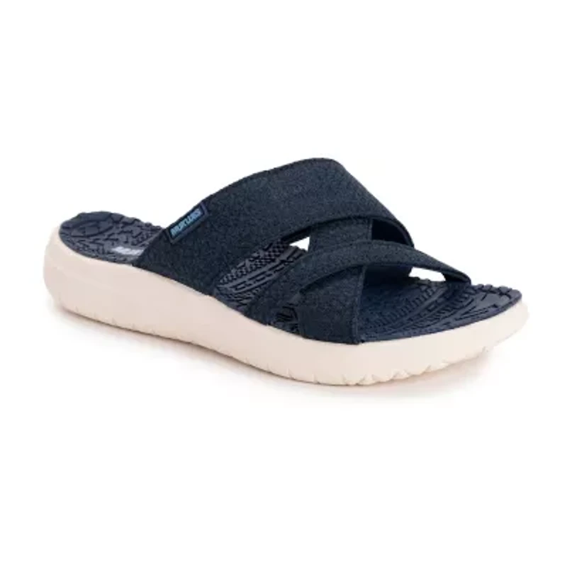 Elevate your summer footwear collection with Muk Luks women's Sassy cross over slide sandal – where style meets comfort in every step. Elevate your summer footwear collection with these sandals, featuring a criss cross strap upper, a fairisle embossed comfort footbed, and a lightweight, flexible sport outsole.