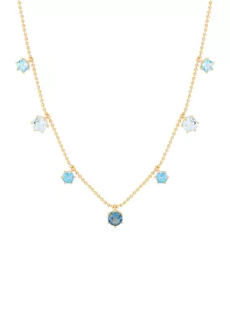 Radiant and refined, this necklace from Belk & Co. showcases a cascade of multi-blue topaz stones set in warm gold over silver. The vibrant hues create a captivating sparkle, making it the perfect piece to elevate both everyday looks and special occasions. 4 Swiss Blue Topaz, 1 London Blue Topaz, 2 Sky Blue Topaz Spring ring clasp Polished finish Imported Belk Exclusive Product Specifications 18" L Material & Care Gold over silver Clean with a soft cloth
