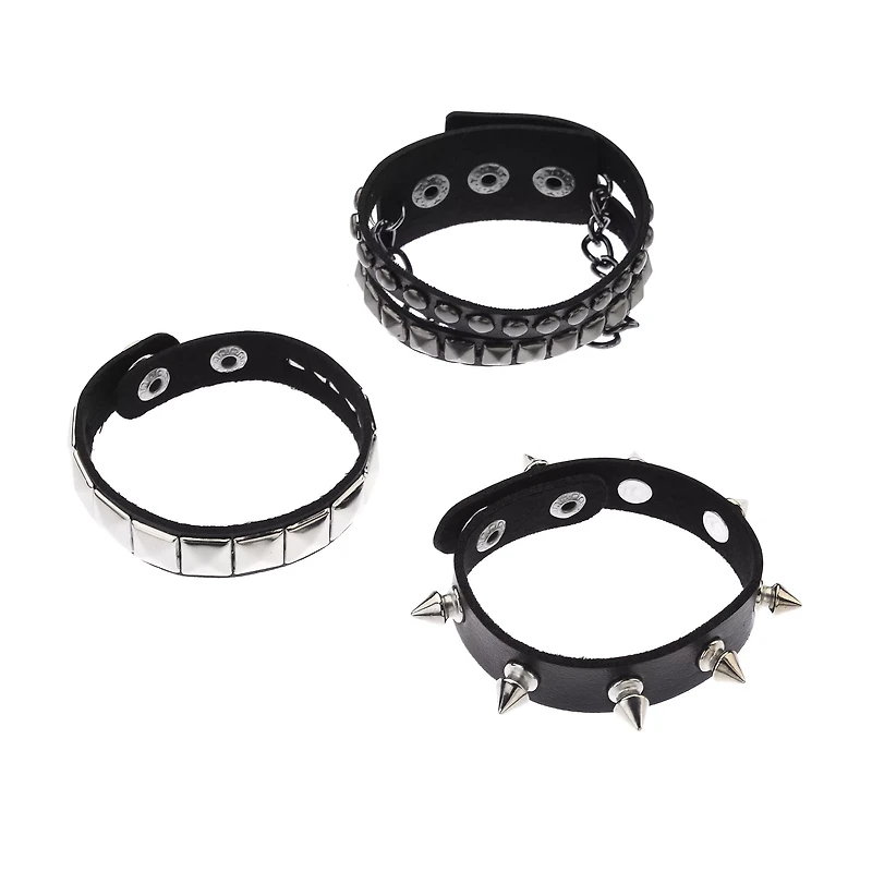 Multi-Pack Black and Silver Studded and Spiked Cuff Bracelets - 3 Pack