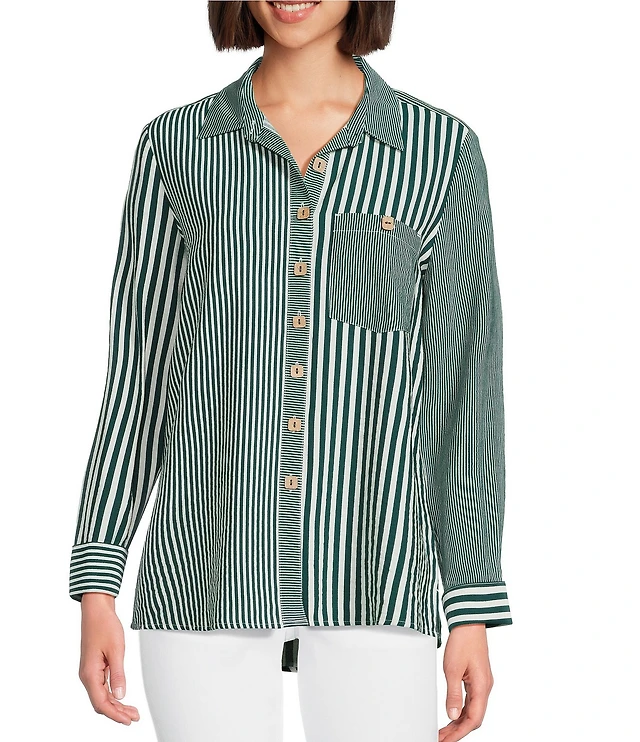 Multiples Petite Size Woven Multi Stripe Print Point Collar Long Turn-Up Cuff Sleeve Button Front Shirt