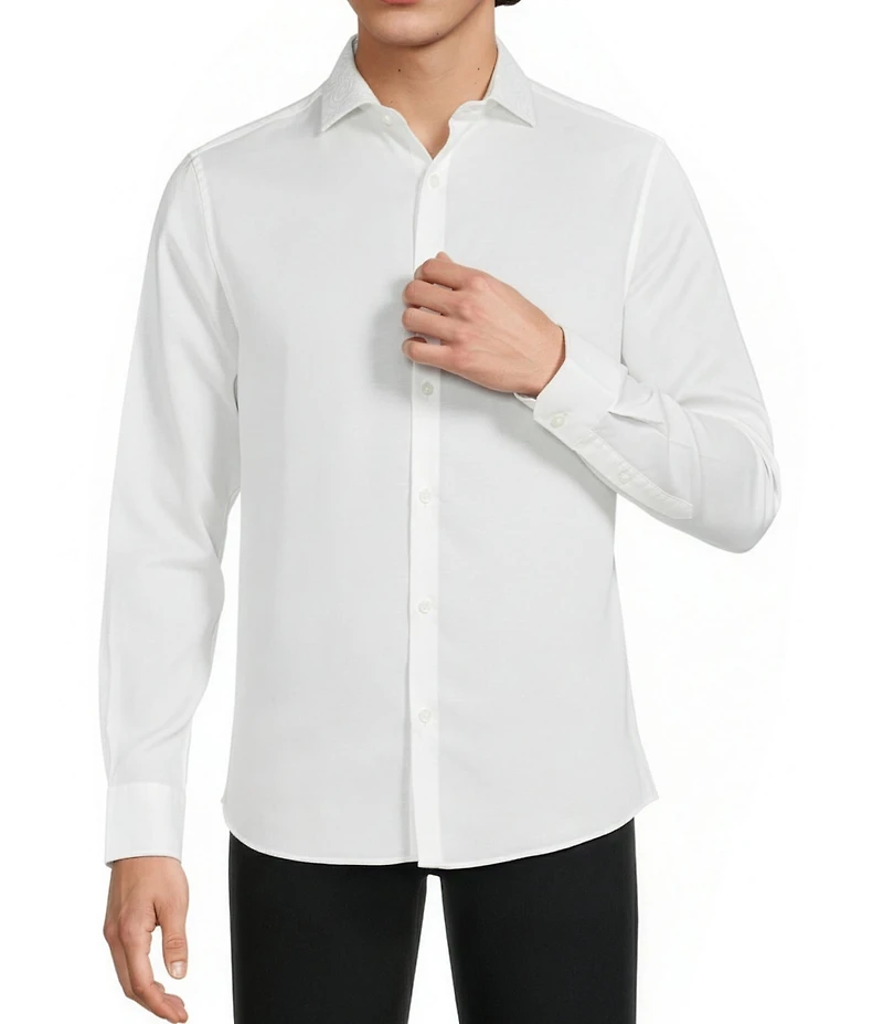 From the Murano, this shirt features: Solid tone with embroidered collar Slim fit Spread collar Long sleeves Button-front closure 100% linen Machine wash/tumble dry Imported.