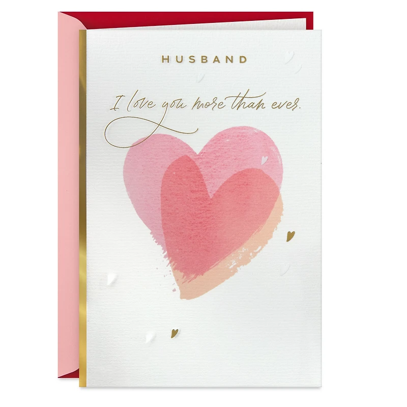 Valentine's Day greeting card for husband features a lovely design of two pink hearts overlapping on a white background softened by a vellum overlay. With embossed hearts, gold foil designs and a message of enduring love, this greeting makes a heartwarming choice.