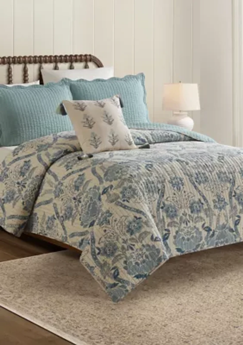 The Mystic Moss Quilt Set from Spartina 449 showcases a detailed damask pattern in soothing bluish-green tones on a soft neutral ground, bringing a touch of sophistication to your space. The set includes two solid shams with scalloped edges, and the quilt reverses to the same solid color for versatile styling. Crafted from breathable 100% cotton fabric and fill, this set offers natural softness and year-round comfort. Machine washable for easy care, it's as practical as it is beautiful. Decorative pillow sold separately. Full/Queen set includes: 88" x 92" quilt and two 20" x 26" shams King set includes: 107" x 92" quilt and two 20" x 36" shams 3-piece set Imported Material & Care Cotton Machine washable