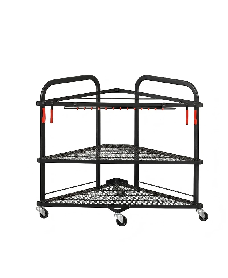 Patented triangular design fits perfectly into corner spaces, maximizing your home gym storage. This rolling metal organizer features 2 mesh shelves, a top yoga mat holder, 4 removable hooks, and 360degree(s)lockable wheels. Ideal for storing yoga mats, foam rollers, dumbbells, resistance bands, and other fitness accessories. Sturdy metal construction ensures long-lasting durability, while the compact size keeps your workout area tidy and accessible.