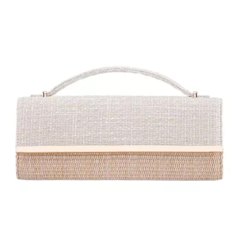 This long east–west flap clutch in paper straw features a chic metal bar detail, plus a top handle and shoulder chain so you can go hands-free.