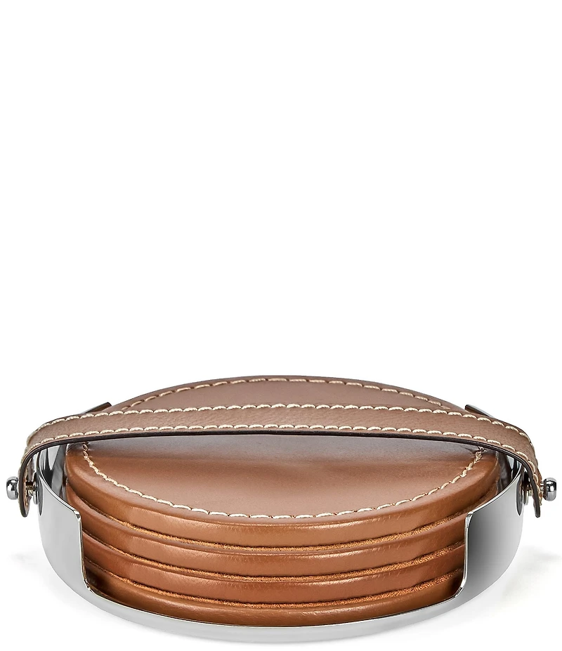 From Nambe, the Tahoe Coasters Set of 4 features: A sleek and modern stainless steel barware collection, Tahoe blends high shine and rich brown leather for a strikingly refined design. With a stainless steel holder and 4 leather coasters, the Tahoe Coaster Set is an entertaining essential, perfect for serving guests cocktails, mocktails, or even a nice bubbly Diet Coke. Set of 4 coasters Stainless steel / genuine leather Tahoe Collection Perfect for serving guests cocktails, mocktails or any drink Leather: wipe clean Stainless steel: dishwasher safe Designer: Antonio Sena Measures: Holder: 4.5" D x 1" Coasters: 4" D x .25" Imported.