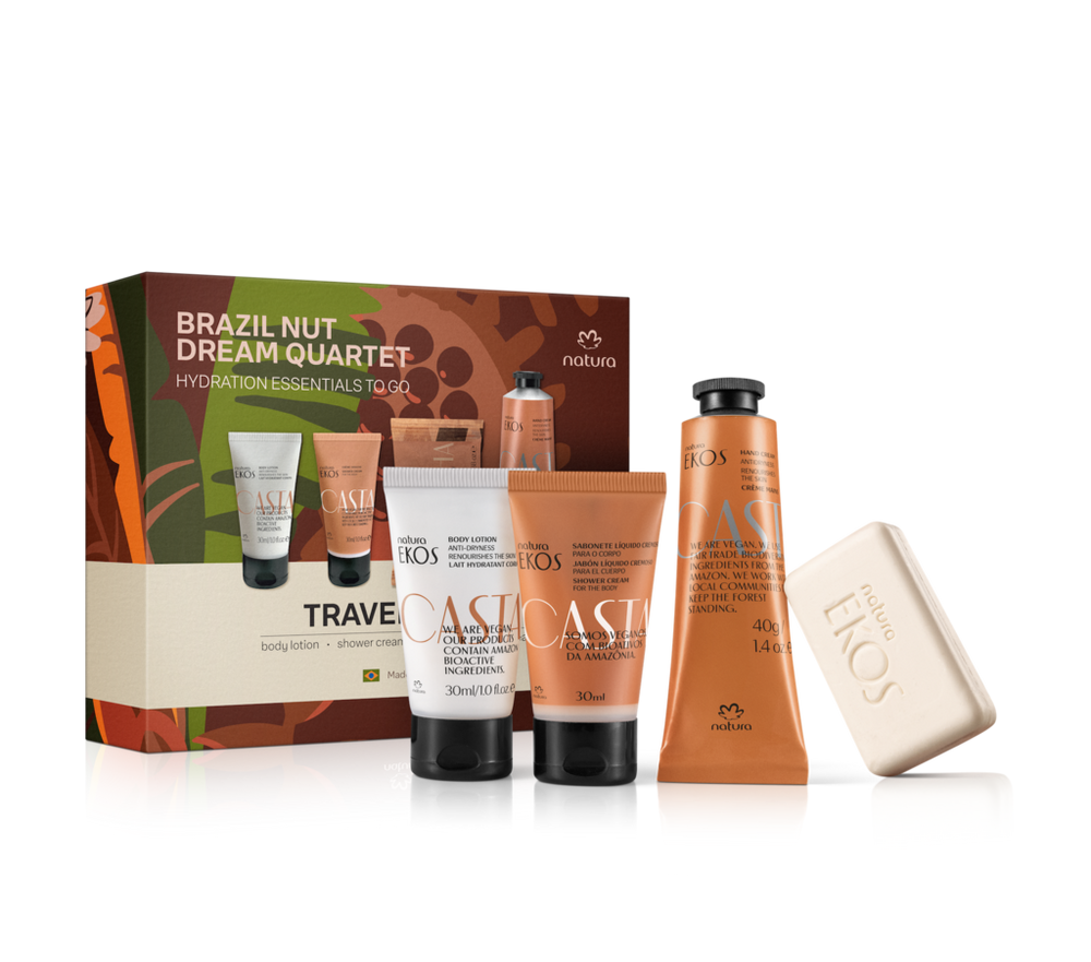 Brazil Nut Dream Quartet Minis Travel. Includes: Ekos Castanha Creamy Shower Gel (1.01fl.oz/30ml): A re-nourishing shower gel that gently cleanses and promotes immediate skin hydration.. Ekos Castanha Body Lotion (1.01fl.oz/30ml): A body-smoothing indulgence for 24 hours of moisture and softness.. Ekos Castanha Hand Cream (1.41fl.oz/40g): One sold every 6 seconds! A skin-loving cream blended with Murumuru butter for a soft and creamy hydration.. Ekos Castanha Soap Bar (0.88oz/25g): Nourishes and deeply hydrates the skin, keeping it soft all day long.. Benefits: Four essentials. One nourishing ritual. Wherever you go. Discover the nourishing power of Castanha (Brazil Nut) oil with this mini set of bestsellers designed for effortless beauty, anytime, anywhere. Perfectly sized for your bag, travel pouch, or weekend escape, these four mini treatments hydrate, soften, and care for your skin, from head to toe. From the brazilian Amazon forest, CASTANHA (Brazil Nut), is rich in omegas 6 & 9 and it has long-lasting hydration for up to 24 hours. Fast-absorbing formula, never-greasy body lotion for instant hydration and healthier skin.. Key Ingredients: Known and revered as the Queen of the Forest, theCastanha(or Brazil nut) is found deep in the forests of the Amazon. Endlessly rich in benefits, both medicinal and beautifying, the castanha produces an oil that deeply nourishes and feeds skin for intense moisturization..