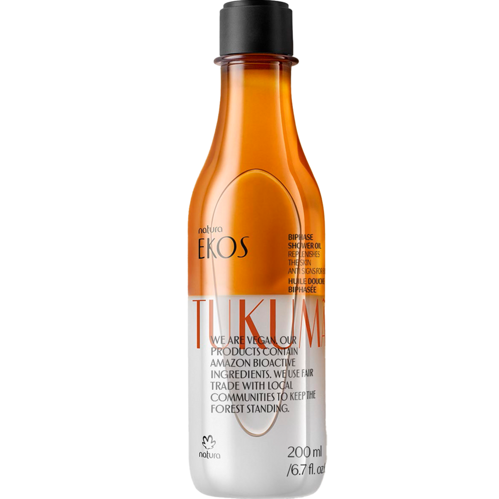 Tukum Biphase Body Oil Hydrating In-S. Features: A lightweight in-shower moisturizing oil, with double dose of Tukum butter and oil: while the oil protects the skins natural hyaluronic acid, the raw butter stimulates the skins natural hyaluronic acid production.. Benefits: Stimulates and protects the skins natural hyaluronic acid production.. Immediately hydrates and smooths skin.. Provides a velvety skin sensation.. 100% vegan.. 97% natural.. 0% silicon.. Key Ingredients: Tukum is a fruit of Amazon native palm tree known for its ability to sprout and grow back even after fires, bringing to life and renewing degraded areas of the Amazon Forest. The raw butter and raw oil extracted from Tukum fruit act together and in a complementary way on the skin the oil protects the skin's natural hyaluronic acid while the butter stimulates the skin's natural hyaluronic acid production. The result is smooth, hydrated, and uniform skin.