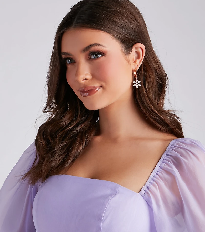 The perfect blend of nautical and charm! These huggie earrings feature rhinestone flower charms on a sleek metal half-hoop with an omega closure. Complete the look in a cute denim jacket for a day date.