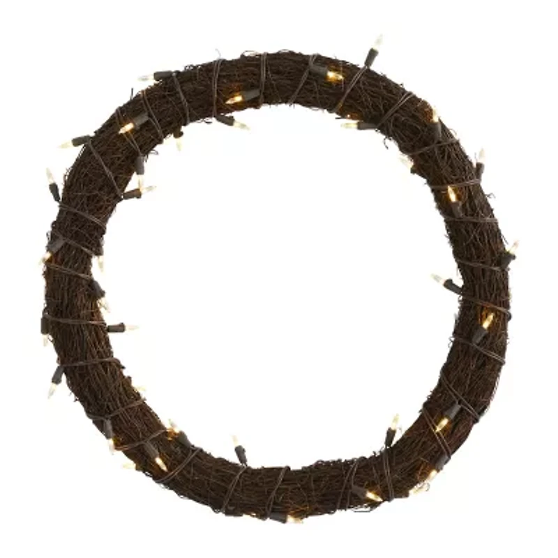 Add a little decorative accenting to an empty wall or doorway with the help of this artificial vine wreath. Intricately designed with a twig-like base, this decorative wreath comes already pre-strung with 50 warm white led lights to give a soft, illuminating glow to an otherwise bare space. Great for year-round display, this 20" (in circumference) faux vine wreath would make for an inviting accent and would inject front door appeal all year round.