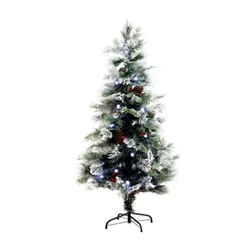 If you're seeking a centerpiece that truly captivates the eye, look no further than this flocked artificial Christmas tree. Drawing inspiration from nature, you'll appreciate the meticulous attention to detail in the varying foliage throughout the silhouette. This unique display presents shades of green, from light to dark, featuring flocked tips as found in the wild. Adding a rustic touch from the outdoors, faux pinecones and berries are nestled amidst the branches. However, the real magic commences when the lights switch on. With 48 flower-shaped, energy-efficient LED lights and fiber optic elements, you can enjoy 8 fiber optic lighting settings, including blinking, solid modes, and more. Standing 5' and anchored by a sturdy metal stand, this tree is versatile enough to enhance any setting. Experience the magic of Christmas year after year with this splendid centerpiece. Its compact size makes it a breeze to store and occupies less real estate in the home, bringing the magic of the season year after year easy.