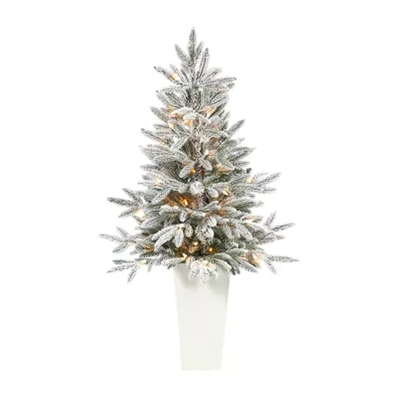 If you're dreaming of a white Christmas, look no further, this flocked Manchester spruce artificial Christmas tree makes your wish come true. Designed to mimic real evergreen foliage and texture, this mini artificial Christmas tree features 133 easy-to-bend branches allowing you to decorate with your mini ornaments. Pre-strung, with 50 lights, for a cozy feel - save time and money. Standing at 44" from a white planter (height includes planter), make a Christmas statement, wherever you curate. Its compact size makes it perfect for kids' rooms, foyers, apartments, and dorms. Silk Christmas trees are manufactured using synthetic materials, such as polyester material or plastic, and are well designed and constructed to be life-like in appearance. This item will need to be re-shaped when removed from the secure box to allow it to reach its fullest size. Your artificial Christmas tree will look beautiful for years to come; simply wipe clean with a soft dry cloth when needed.