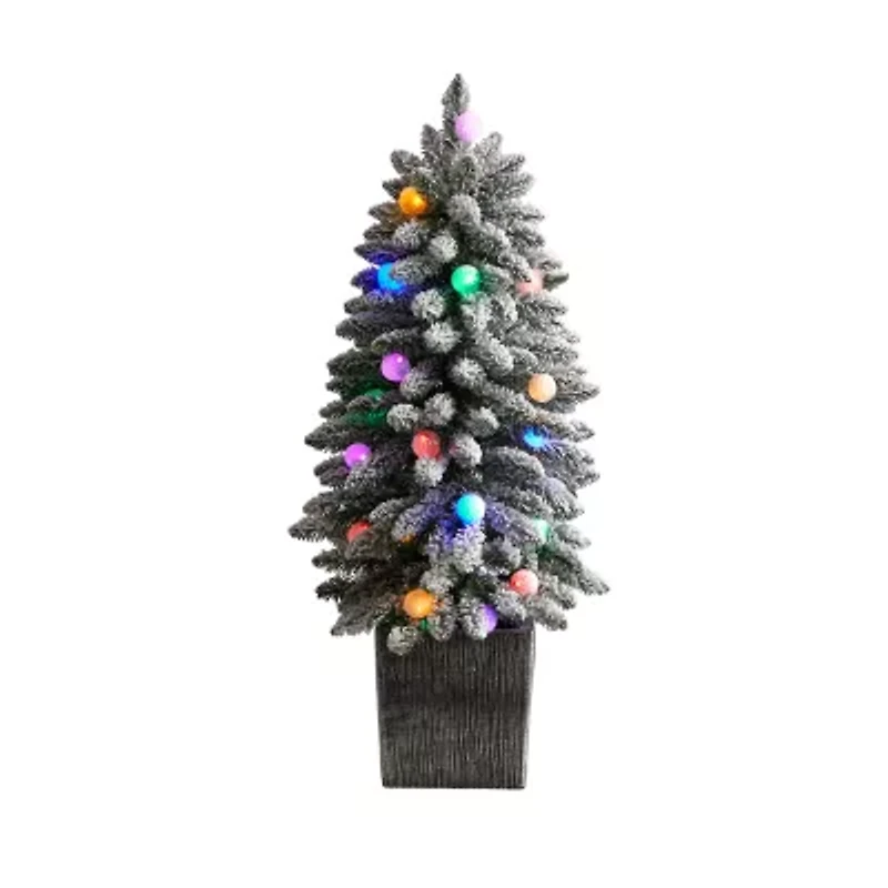 Show your true colors during Christmas with this flocked artificial Christmas tree. Inspired by nature, this robust silhouette mimics the real natural foliage and texture found in their European counterparts with snow in the easy-to-bend branches. Arriving pre-strung with 20 led lights, illuminate your space with disco ball like lights, which bring a colorful addition to the holidays. Standing 3ft. From a decorative planter, feel free to add in any compact area in need of Christmas cheer. This is a favorite among kids that love bright colors. Faux Christmas trees are manufactured using synthetic materials, such as polyester material or plastic, and are well designed and constructed to be life-like in appearance. This item will need to be re-shaped when removed from the secure box to allow it to reach its fullest size. Your artificial Christmas tree will look beautiful for years to come; simply wipe clean with a soft dry cloth when needed.
