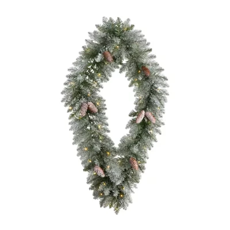Spread holiday cheer to any area with this Kite Inspired Flocked Christmas Artificial Wreath. The kite shape will delight all who lay sight at the fun geometric shape, perfect for any style decor, including boho, modern and contemporary. Inspired by nature, evergreens are adorned by pinecones that add a rustic touch. Make holiday nights cozier with the 50 LED lights that are more energy-efficient. With a height of 3ft., this kite is right for setting the scene. Add any bare wall or door. Artificial wreaths are manufactured using synthetic materials, such as polyester material or plastic, and are well designed and constructed to be life-like in appearance. This item will need to be re-shaped when removed from the secure box to allow it to reach its fullest size. Your wreath will look beautiful for years to come; simply wipe clean with a soft dry cloth when needed.