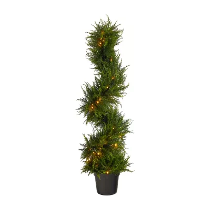 Create a cozy scene during your next dinner party with this spiral cypress artificial tree. Realistic, groomed cypress fronds are shaped into a spiral silhouette, nestled in between, are 80 clear led lights - that create an intimate glow. Recreate the look of your favorite outdoor restaurant from the comfort of your own backyard or patio. Standing 45" from a nursery planter, curate in indoor / outdoor areas that need some light and shape. Perfect for apartments, balconies, backyards, or patios. Silk trees are manufactured using synthetic materials, such as polyester material or plastic, and are well designed and constructed to be life-like in appearance. This item will need to be re-shaped when removed from the secure box to allow it to reach its fullest size. Your artificial plant will look beautiful for years to come; simply wipe clean with a soft dry cloth when needed.