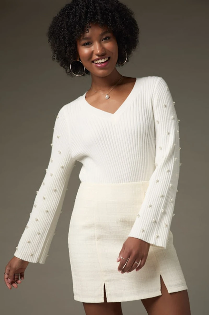 Nellie Pearl Embellished Pullover Sweater White