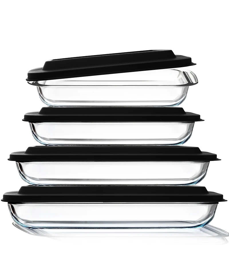 Enjoy organizing baking and storage with Nestl's 4-Pack Glass Baking Dishes, including 4 containers and lids in assorted sizes. Made of durable borosilicate glass, they go from freezer to oven safely. Air-tight, leakproof lids make them perfect for meal preparation. Fridge, freezer, oven, microwave dishwasher safe.