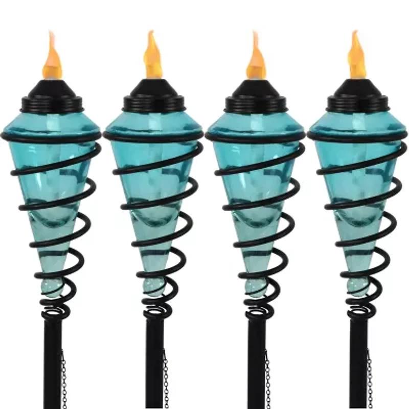 This set of 4 torches features beautiful, colored glass fuel containers that are attractively illuminated by torch light. The torches are encased in a metal casing that swirls elegantly for a contemporary or modern look to your backyard or other outdoor setting. Plus, this set of torches includes 4 fiberglass wicks that burn longer than regular wicks so you can keep the night going effortlessly. The fuel containers may be filled with torch or bio ethanol fuel (please note, this set of torches does not come with fuel; fuel must be purchased separately). Safely extinguish the flame on each torch with the included snuffers, which are conveniently attached to each torch by a chain. The set also includes ground stakes and deck clamps, providing the option to use them in the yard or on the deck rails. The stakes also ensure that these torches will never blow away or easily fall down in harsh weather.