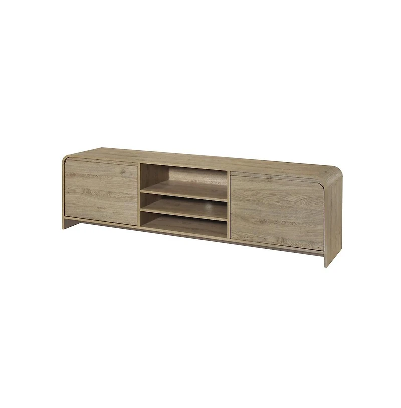 Introducing the Mara 70"" Tv Console in Walnut, a perfect blend of style and for your entertainment needs. Crafted from sturdy manufactured wood and coated in environmentally friendly laminate, this console boasts durability. Its ample top surface accommodates large screen televisions, while shelves offer space for entertainment components. Two spacious drawers discreetly store games, controllers, and other family room essentials. The minimalist design, featuring curved drawer fronts and waterfall-style tops and sides, adds a modern touch to any space. Finished in a classic walnut hue, it effortlessly complements a variety of decors, enhancing the aesthetic of your room. Upgrade your entertainment area with the Mara 70"" Tv Console in Walnut.