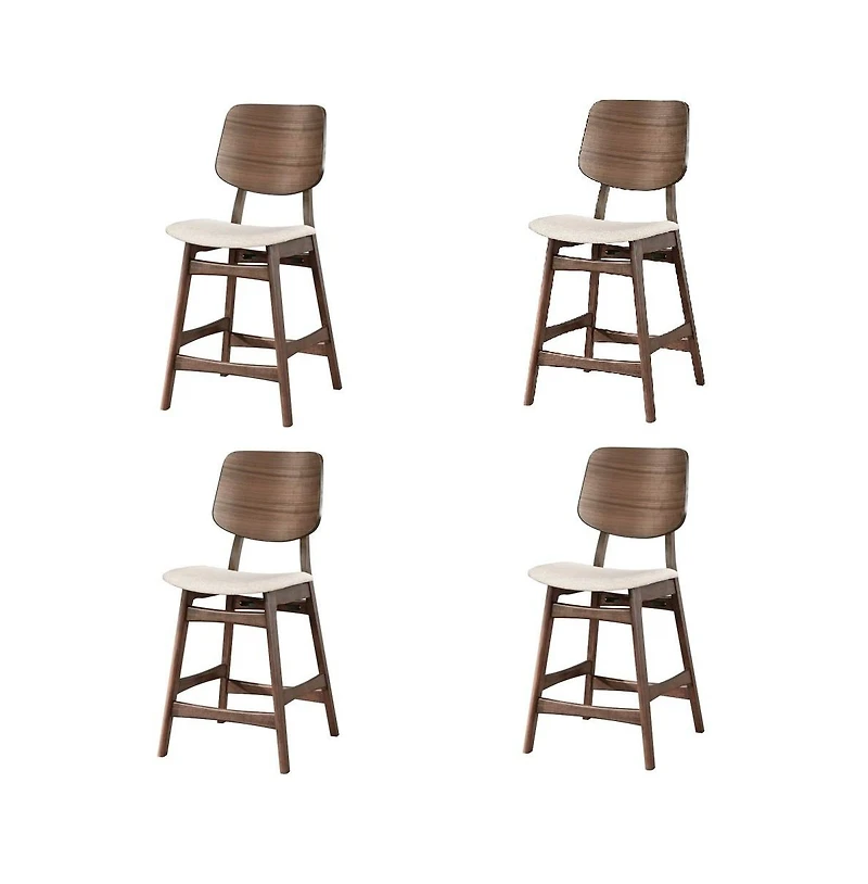 The Oscar Mid-Century Modern Counter Height Chairs (Set of 4) feature solid rubberwood frames, walnut veneers, and reinforcing base stretchers for lasting durability. Clean lines, curves, and a clear walnut finish reflect classic mid-century design. Foam seat cushions wrapped in beige 100% polyester add comfort and style. Perfect for any counter height table, these chairs offer a timeless look with modern functionality and everyday comfort.