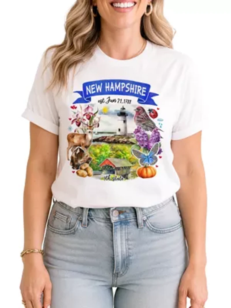 New Hampshire’s charm is captured through a cozy, storybook-style collage that blends rugged nature with small-town warmth, featuring a classic coastal lighthouse, forest wildlife like deer and songbirds, and seasonal touches such as pumpkins, wildflowers, and farm details. The artwork balances mountains, shoreline, and countryside to reflect the state’s mix of outdoor adventure and quiet New England living, all framed with the founding date and state number for a proud, heritage-inspired feel. Printed on a soft, breathable tee that’s comfortable for everyday wear, the design feels easygoing and nostalgic—perfect for showing love for the Granite State without trying too hard. Pullover Crew neck Short sleeve, Drop shoulder sleeves Unlined USA Imported Product Specifications Regular Material & Care 100%CombedCotton Machine washable