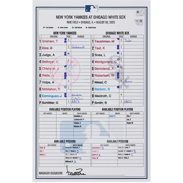 New York Yankees Game-Used Lineup Card vs. Chicago White Sox on August 30, 2025