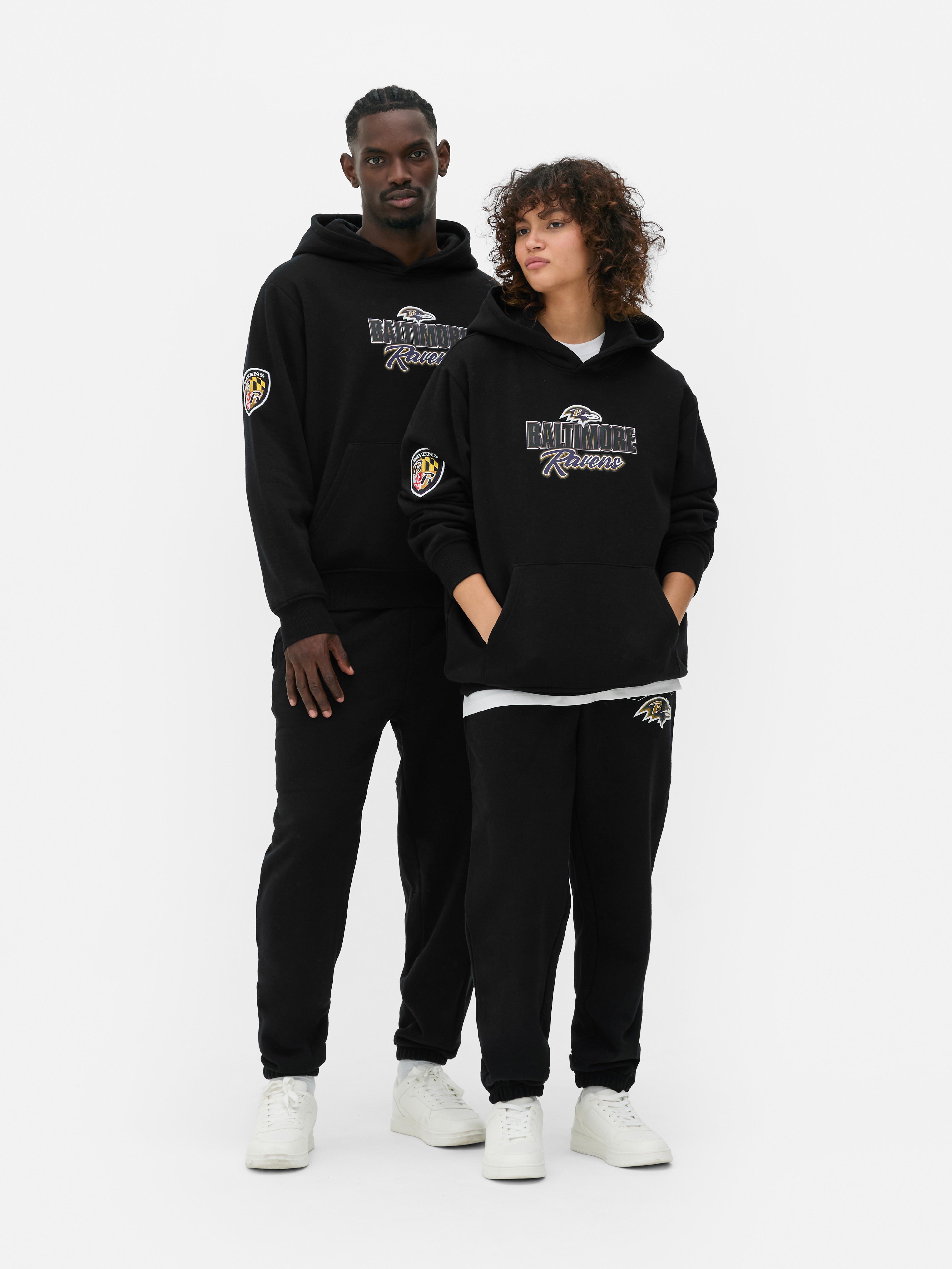 A Printed hoodie with long sleeves, deep hood, and Baltimore Ravens design
