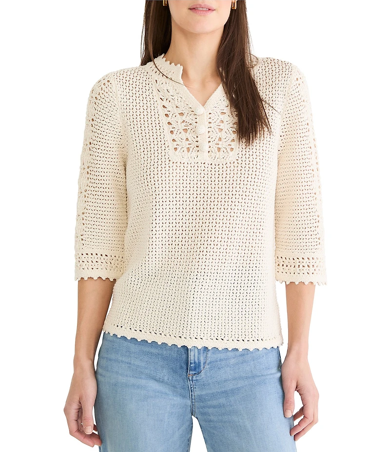 NIC + ZOE Crochet Mesh Split Neck Elbow Sleeve Top