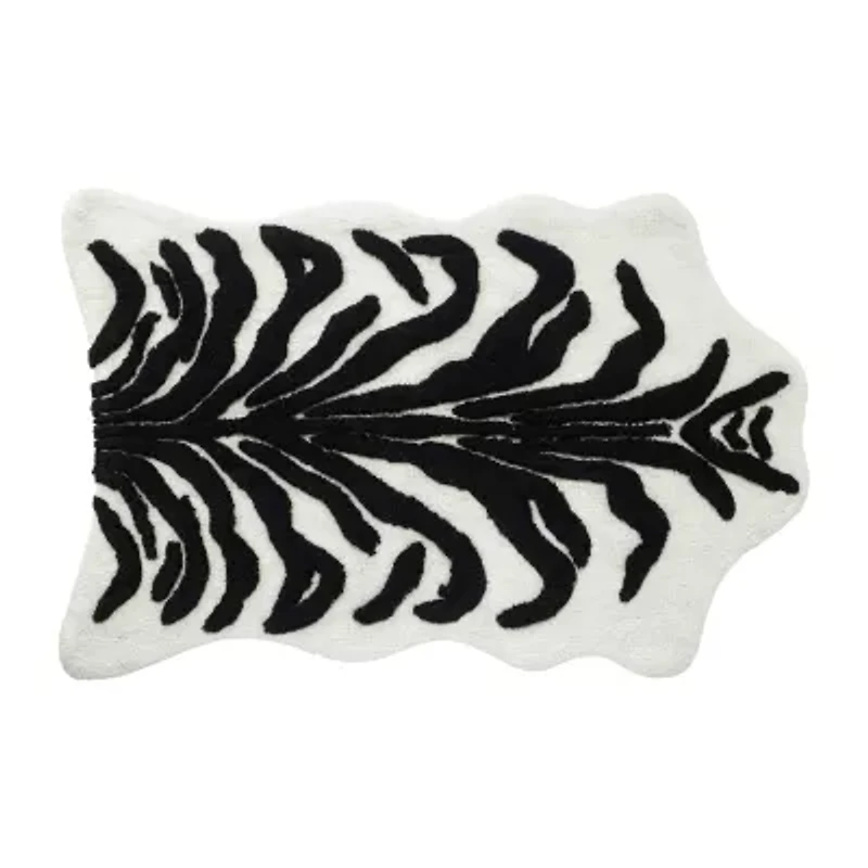 The Nicole miller Sydney bath rug features a black and white zebra design, shaped like an animal skin rug. Tufted of 100% cotton for a great look, super softness, and outstanding absorbency. 20" x 32" with non-skid latex back.