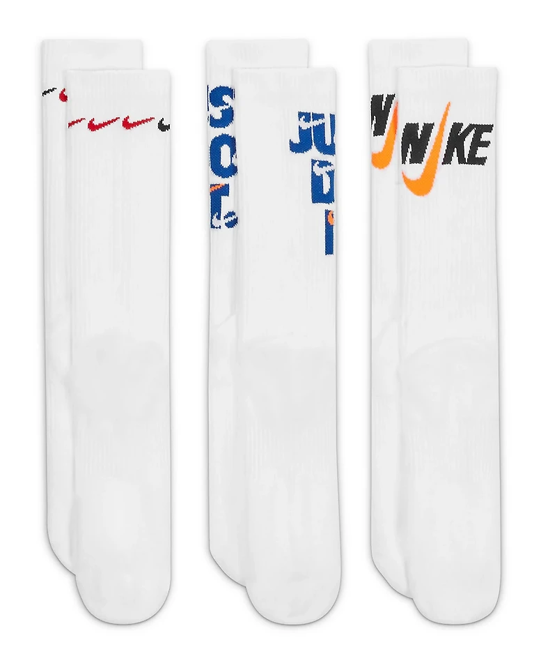 Nike introduces the 3 pack of Everyday Plush Cushion white crew socks. The socks each feature a different design showing up Nike Swoosh branding for a classic yet modern look. Comfortable cushioning and arch support provide a superior feel.