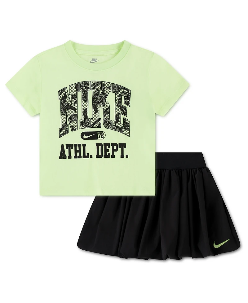 Offering iconic Nike style, this 2-piece set pairs a boxy graphic T-shirt with a woven skort that has a bubble hem and built-in undershorts. Moisture-wicking technology helps keep little ones dry during play.
