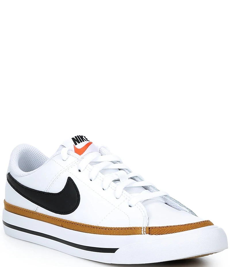 From Nike, the Kids' Court Legacy GS Sneakers feature: Durable leather has classic tennis style Swoosh license plate on back heel tape Debossed "NIKE" block lettering on heel tab They are durable and comfy with heritage stitching and a retro Swoosh Soft foam cushioning brings lightweight comfort Plush foam insole The rubber sole with herringbone pattern provides traction and heritage looks Imported.