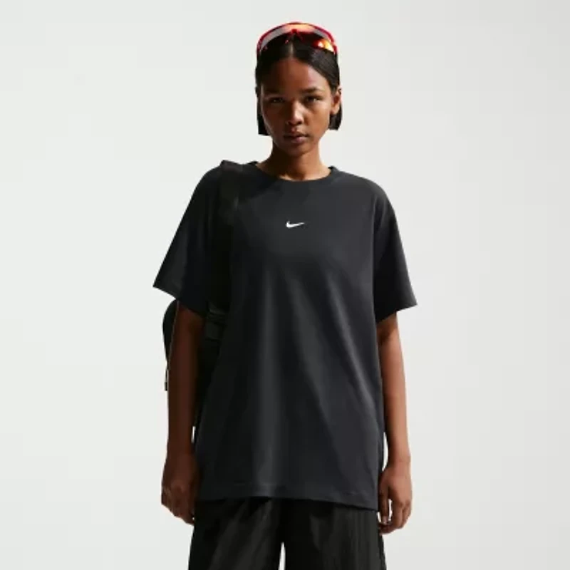 Stay cool and comfortable in this Nike women's active t-shirt. Designed with a oversized fit and a classic crew neck, this short sleeve layer features a convenient pullover head design for effortless wear. Whether you're heading to the gym or running errands, this versatile top provides a relaxed silhouette that moves with you throughout the day.