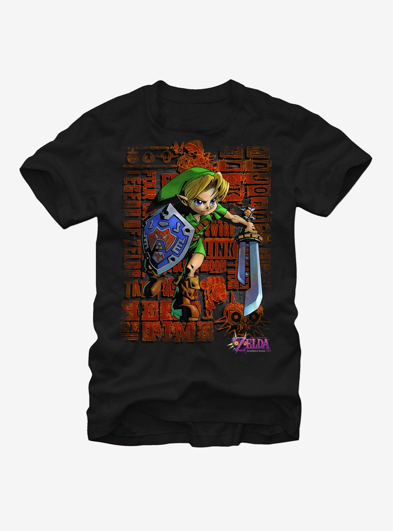 Join Link and save Termina from impending doom with the Nintendo Legend of Zelda Link Dash Black T-Shirt! Link runs across the front of this awesome black shirt with a unique text filled backdrop and the Legend of Zelda: Majora's Mask 3D logo below. 100% Cotton.