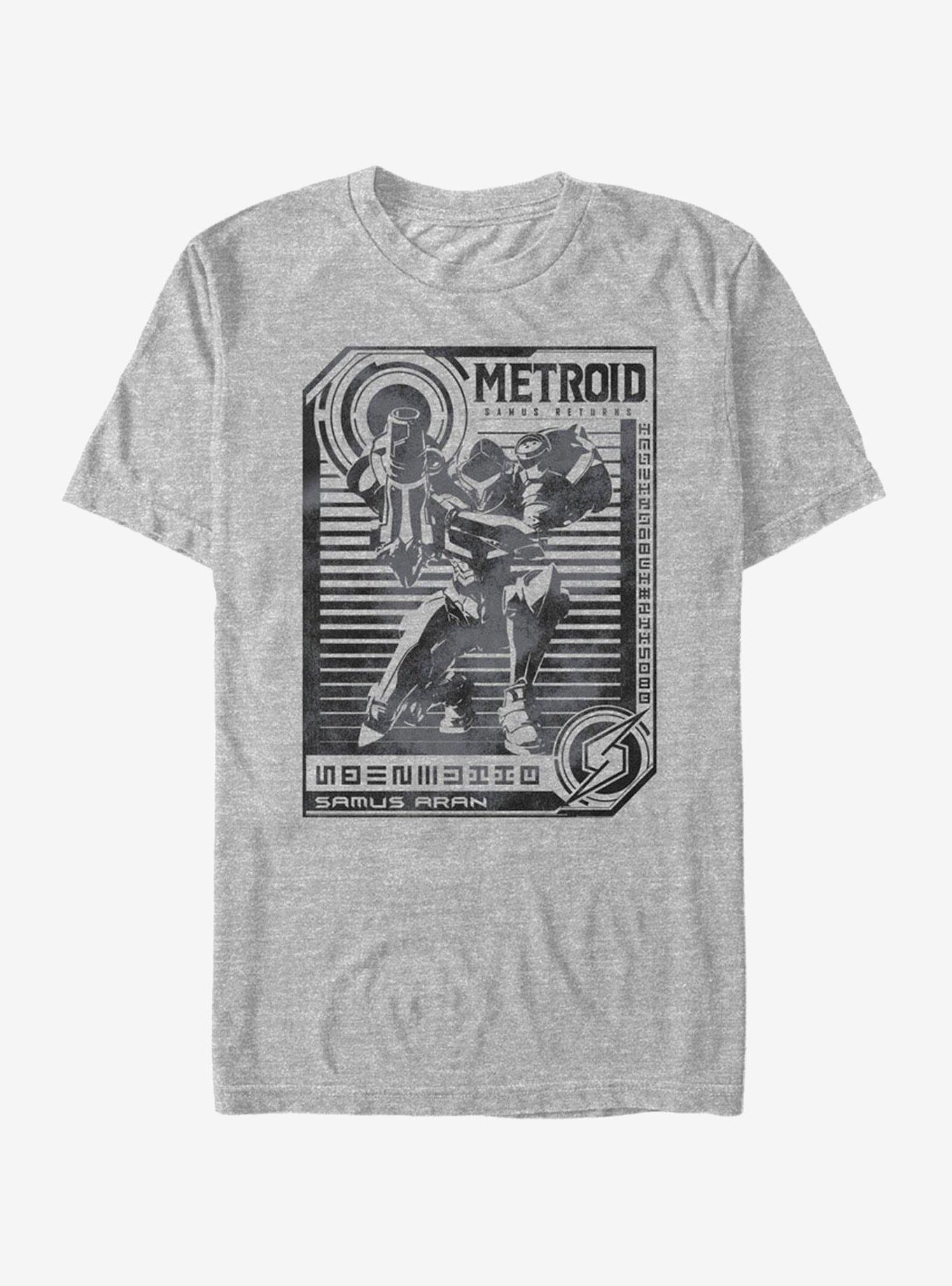 Everyone needs to look sharp to fight Space Pirates so be sure you don't miss the Nintendo Metroid Samus Aran Stripe Heather Gray T-Shirt! The coolest bounty hunter in the galaxy, Samus Aran, is portrayed in distressed black print across this awesome gray Metroid shirt. 50% Cotton, 50% Polyester.