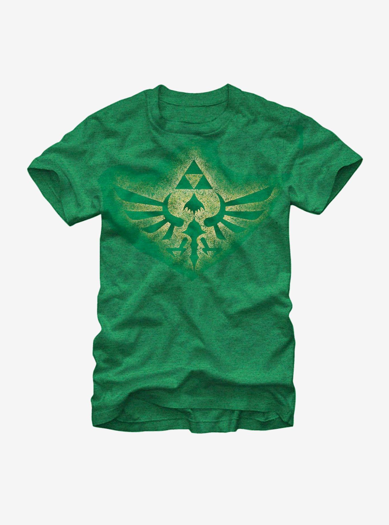 Harness the ultimate source of power in the Zelda series with the Nintendo Soaring Triforce Heather Kelly Green T-Shirt. The history of Hyrule comes to life with this men's graphic tee featuring the Triforce resting proudly above the Hylian Crest. 60% Cotton, 40% Polyester.
