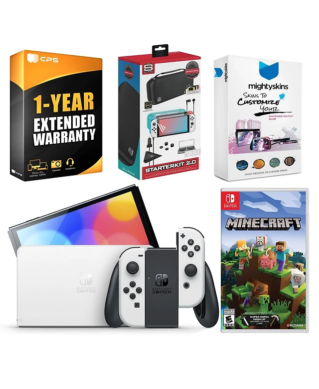 Nintendo Switch White Oled Console with Minecraft: Switch Edition, Surge Accessory Gaming Kit, MightySkins Console and Controller Skin Voucher